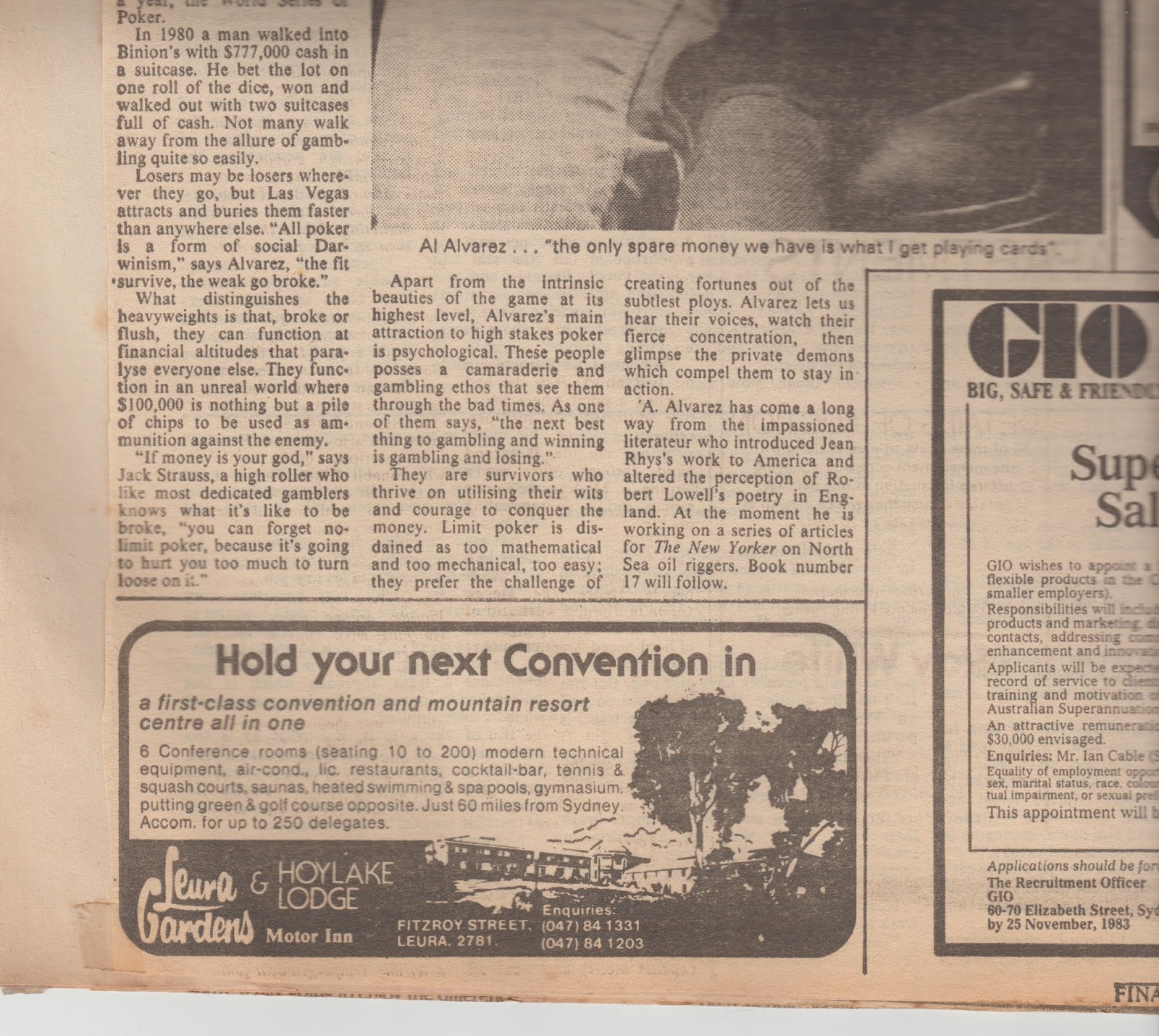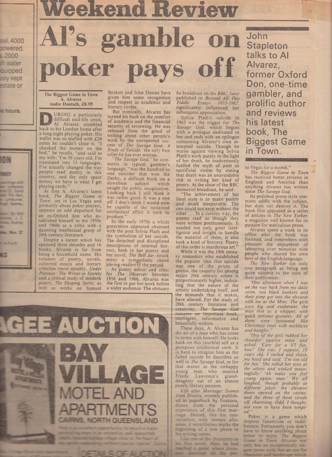 This is an interview with one of the idols of my youth Al Alvarez. He wrote that classic study of suicide and the poet Sylvia Plath, The Savage God. Plath suicided in London, in the former apartment of W.B. Yeats. We became friendly for a while after the interview, and went walking near his home on Hampstead Heath. I was completely fascinated by his tales of literary shenanigans. He knew everybody; a lovely man and very helpful to me.