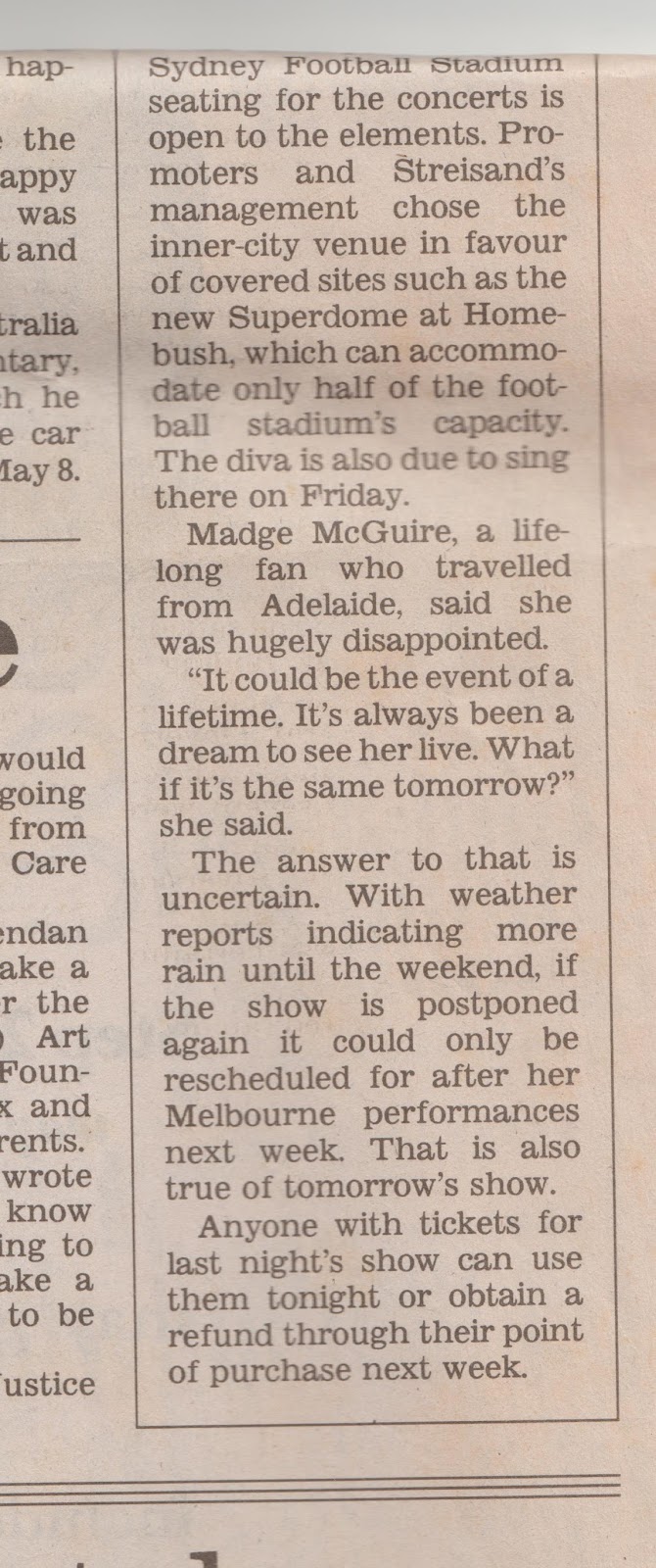 Babs is washed out of stadium, The Australian, 9 March, 2000.