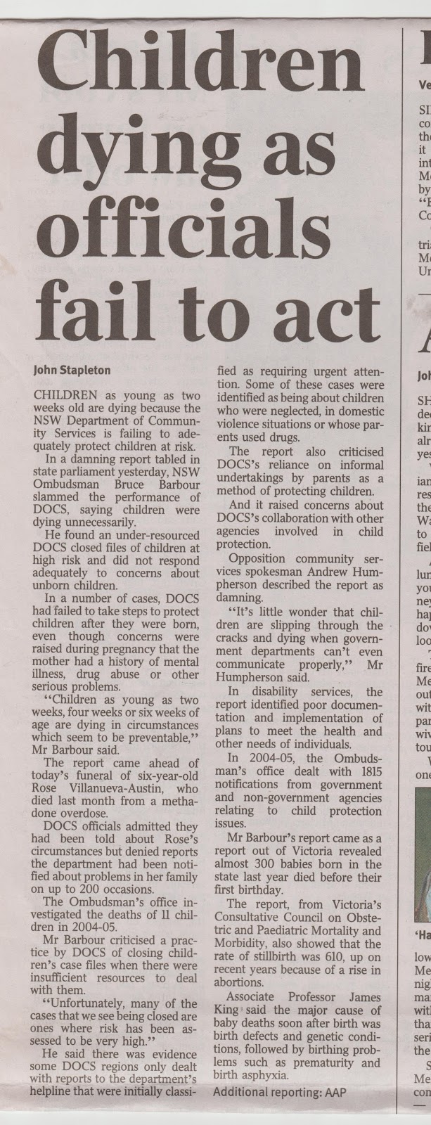 In a damning report tabled in state parliament yesterday, NSW Ombudsman Bruce Barbour slammed the performance of DOCS, saying children were dying unnecessarily.