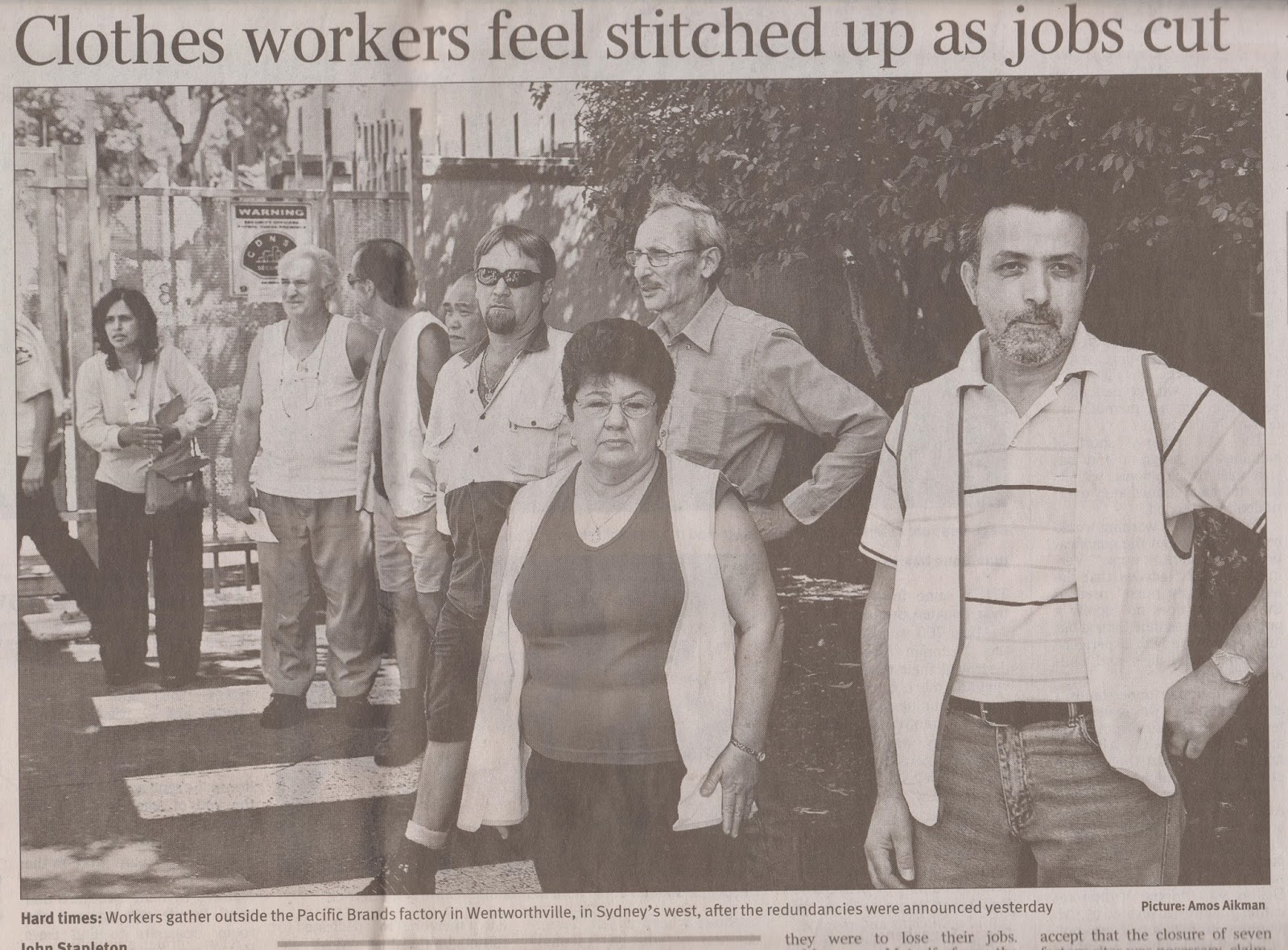 As union officials held what they described as an unproductive meeting with management at the Bonds factory in western Sydney, workers of the seven factories to close in NSW, Victoria and Queensland wondered how they would find work in a downturn.