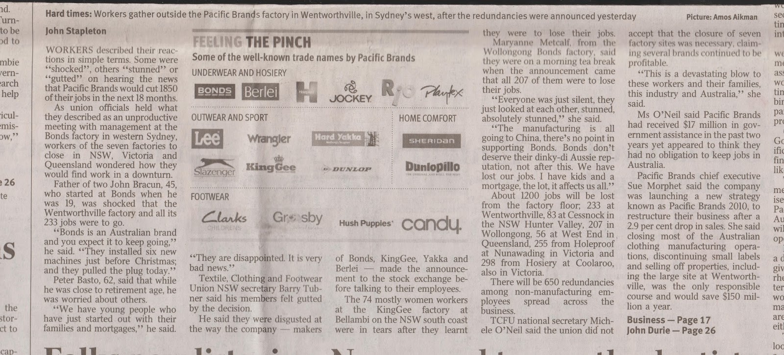 Pacific Brands chief executive Sue Morphet said the company was launching a new strategy known as Pacific Brands 2010, to restructure their business after a 2.9 per cent drop in sales. She said closing most of the Australian clothing manufacturing operations, discontinuing small labels and selling off properties, including the large site at Wentworthville, was the only responsible course and would save $150 million a year.