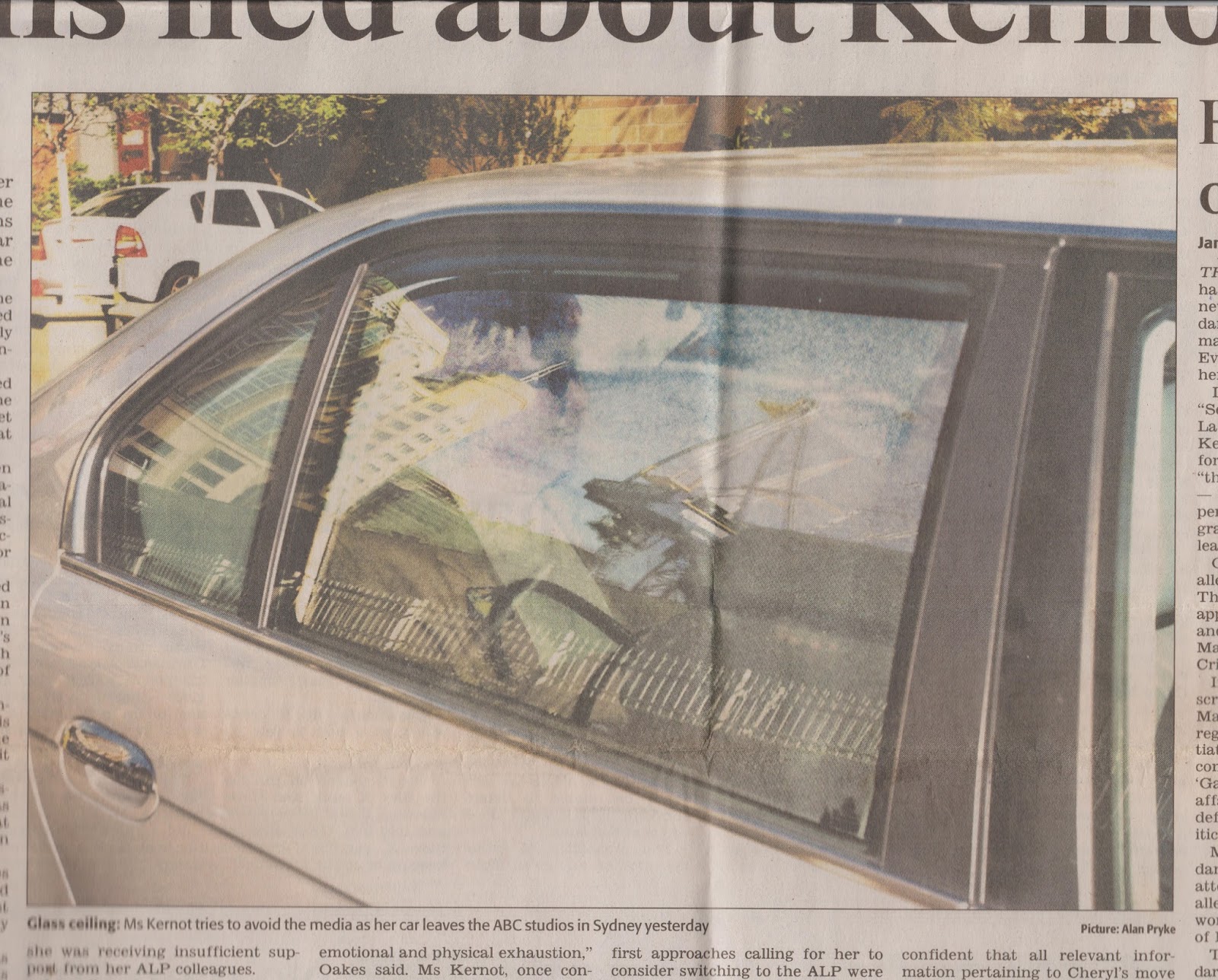 Caption: People in glass houses: Ms Kernot tries to avoid the media as her car leaves the ABC studios in Sydney yesterdayPicture: Alan Pryke; Photo: Photo