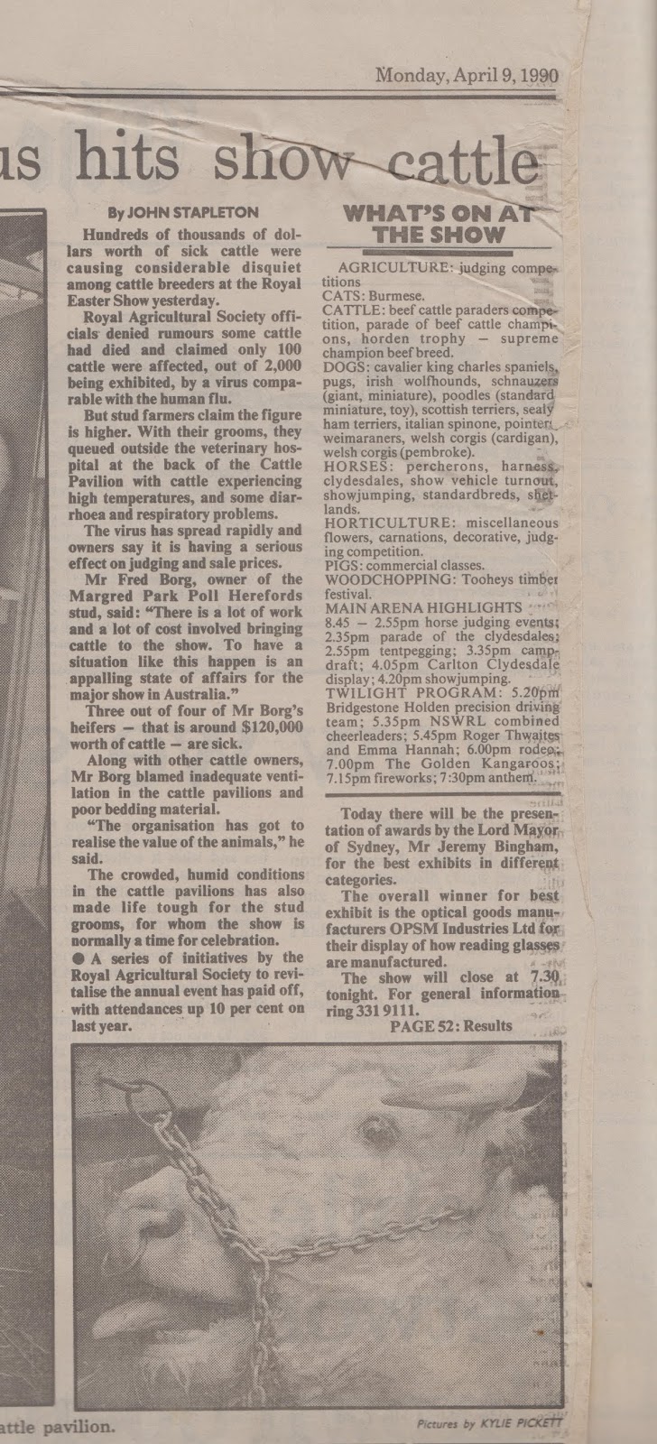 Farmers protest as virus hits show cattle, The Sydney Morning Herald, 9 April, 1990. Pic Kylie Pickett.