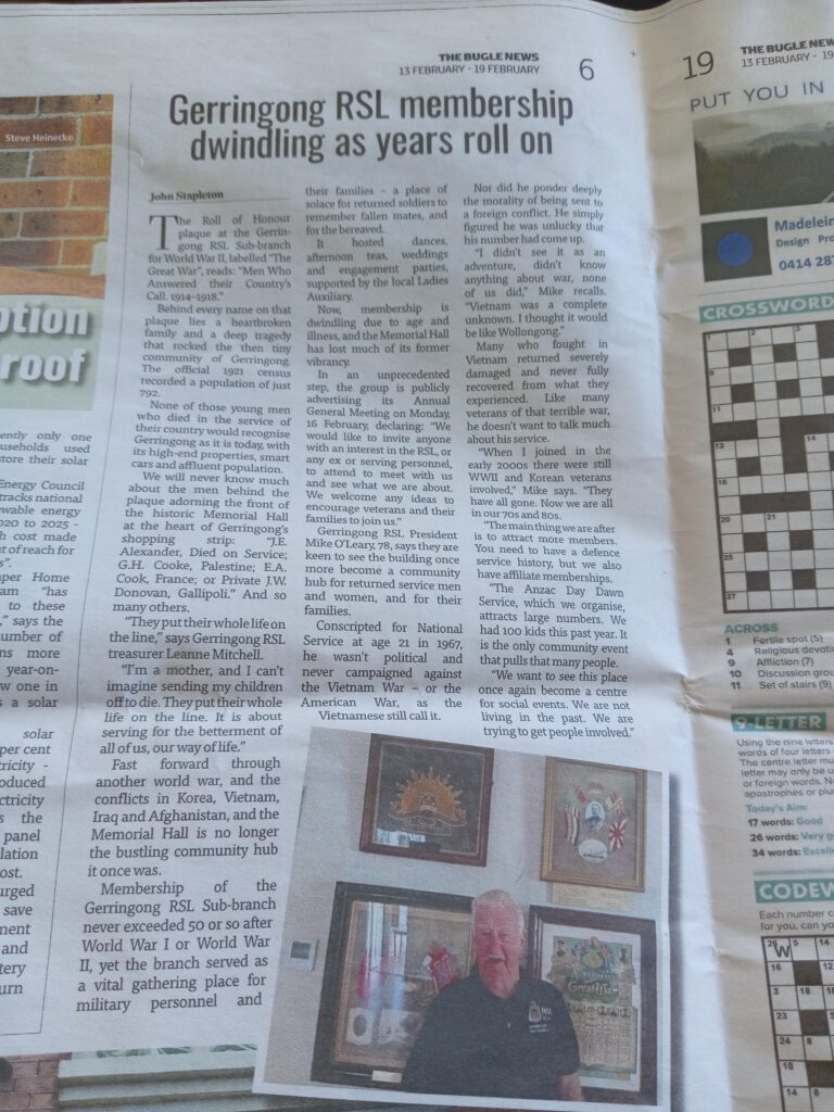 “They put their whole life on the line,” says Gerringong RSL Treasurer Leanne Mitchell. “I’m a mother, and I can’t imagine sending my children off to die. They put their whole life on the line. It is about serving for the betterment of all of us, our way of life.”