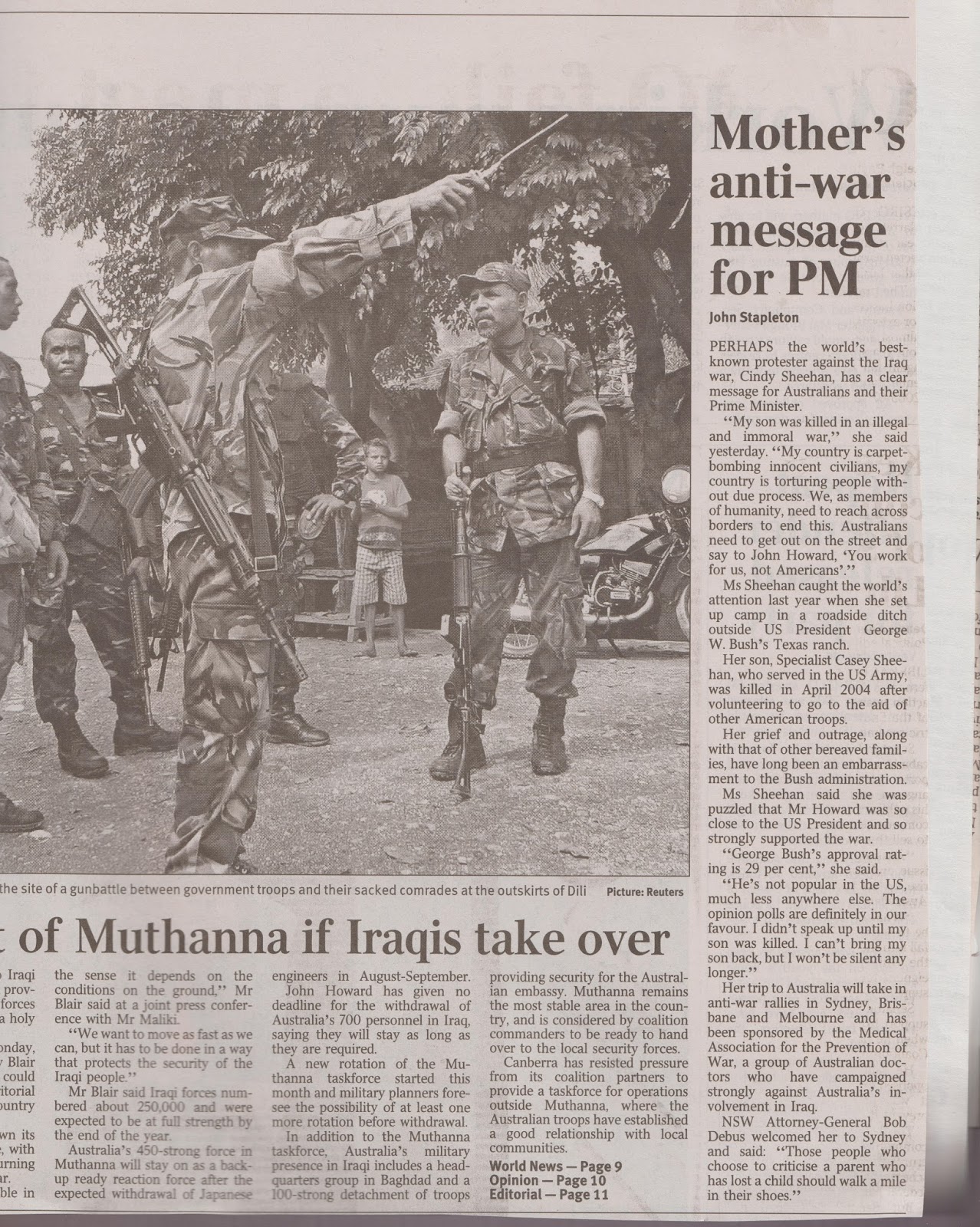 “My son was killed in an illegal and immoral war,” she said yesterday. “My country is carpet-bombing innocent civilians, my country is torturing people without due process. We, as members of humanity, need to reach across borders to end this. Australians need to get out on the street and say to John Howard, `You work for us, not Americans’.”