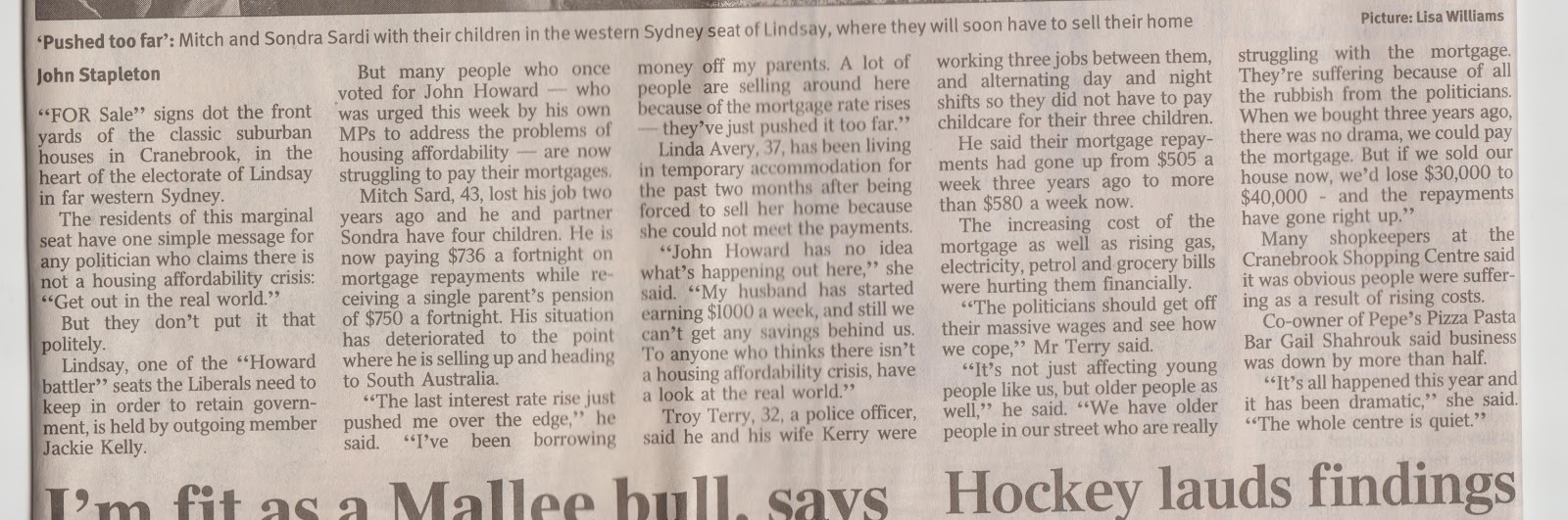 But many people who once voted for John Howard – who was urged this week by his own MPs to address the problems of housing affordability – are now struggling to pay their mortgages.