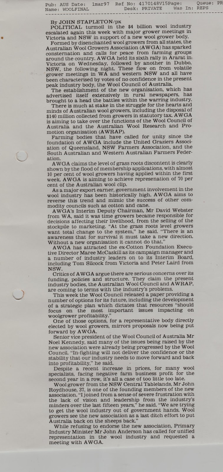 Political turmoil in the wool industry, The Australian, 1 March, 1997.