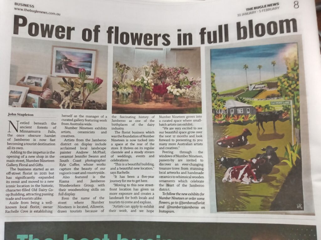 Aside from being a well-known local florist, owner Rachelle Cove is now establishing herself as the manager of a curated gallery featuring work from Australia wide. Number Nineteen exhibits artists, ceramicists and creatives. Artists from the Jamberoo district currently on display include acclaimed local landscape painter Andrew McPhail, ceramist Jennifer Swann and south coast photographer Kyle Coffee, whose works capture the beauty of our region’s coast and countryside.