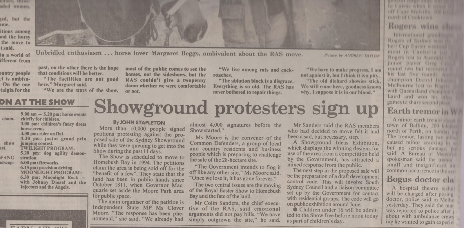 Showground protesters sign up, The Sydney Morning Herald, 17 April, 1990.