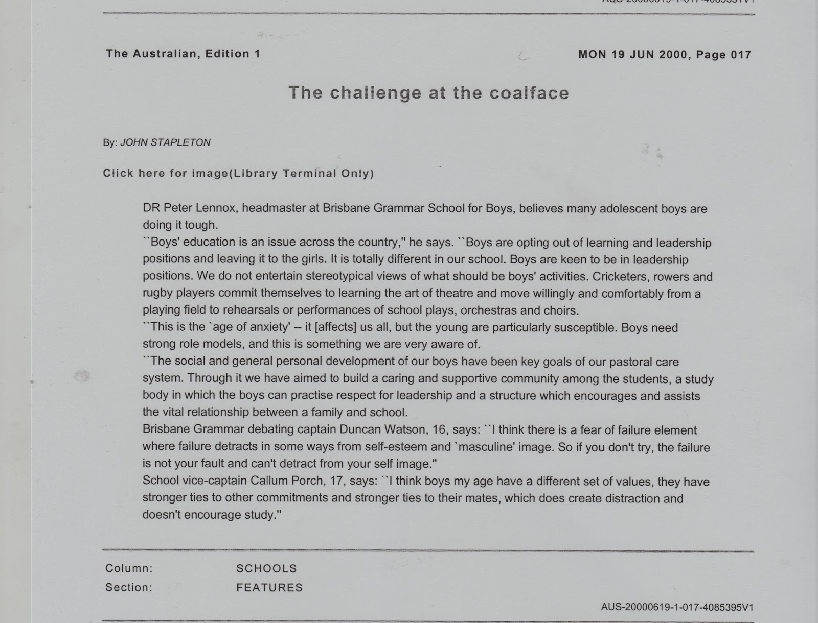 The challenge at the coalface, The Australian, 19 June, 2000.