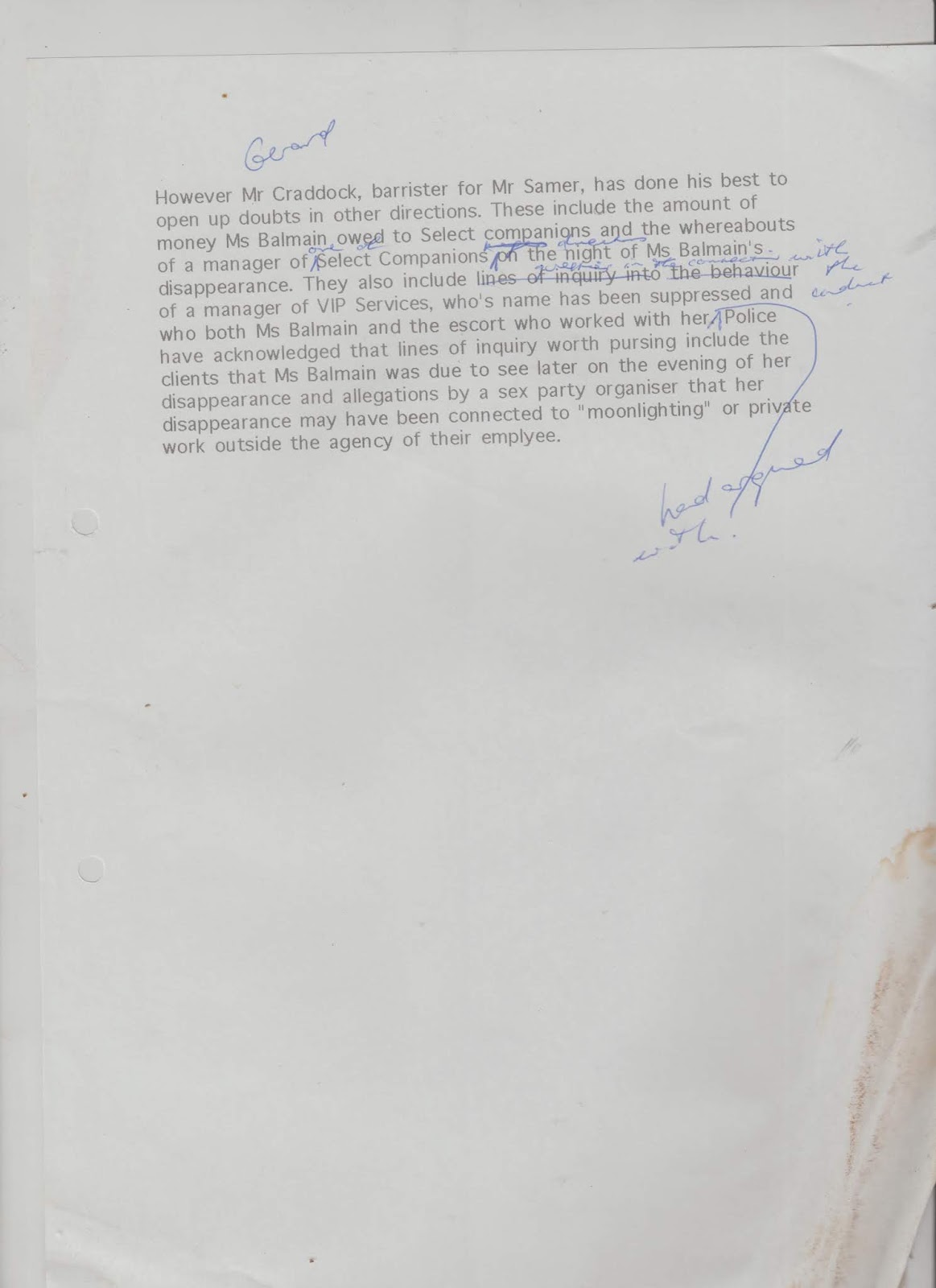 The Disappearance of Revelle Balmain, Glebe Coroner’s Court, Circa December, 1994. Original copy.