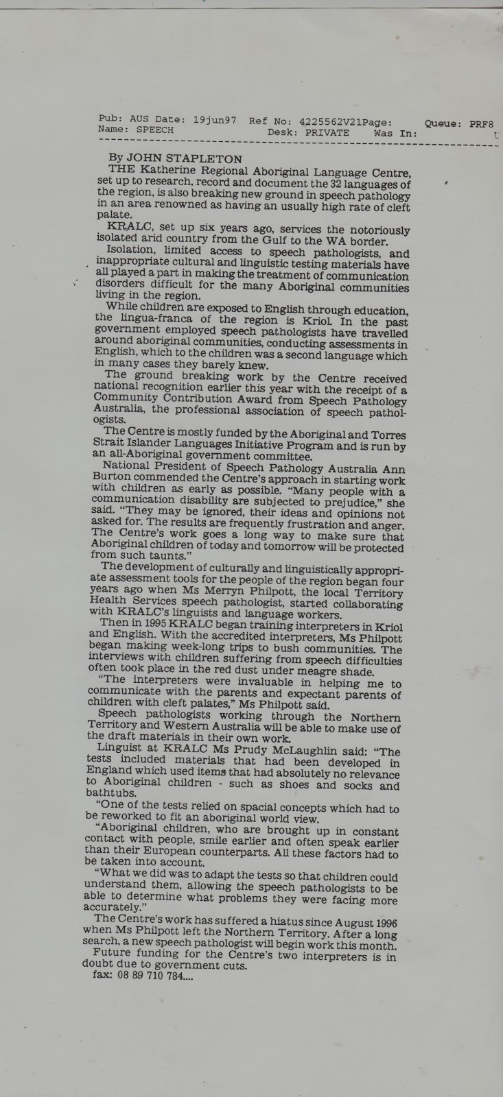 The Katherine Regional Aboriginal Language Centre, The Australian, 19 June, 1997.