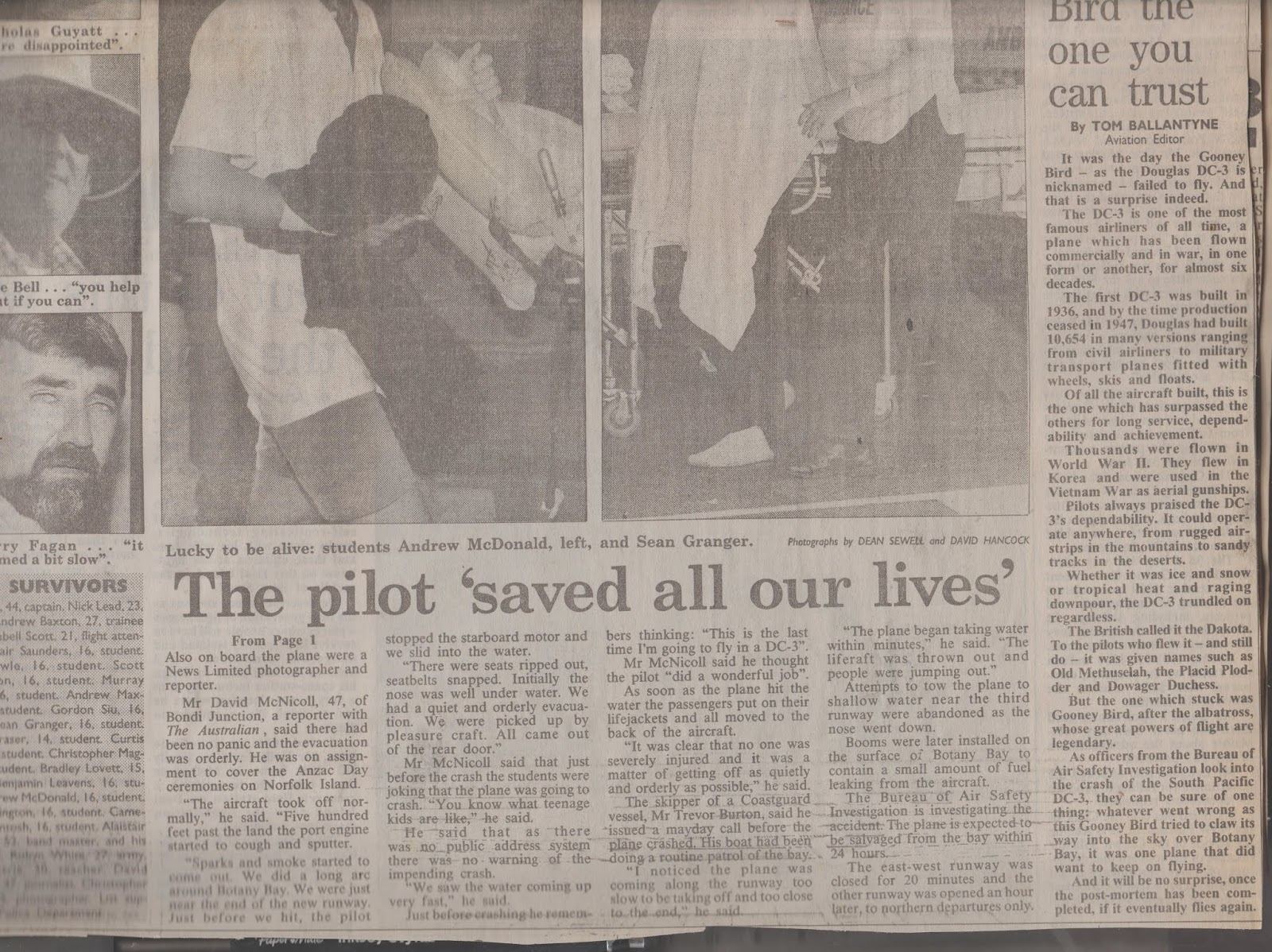 The pilot was a hero … he saved all our lives, Sydney Morning Herald, 25 April, 1994. Page One. Picture Dallas Kilponen.