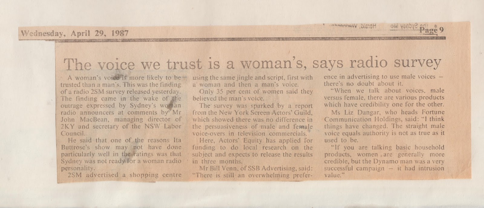 The voice we trust is a woman’s says radio survey, The Sydney Morning Herald, 29 April, 1987.